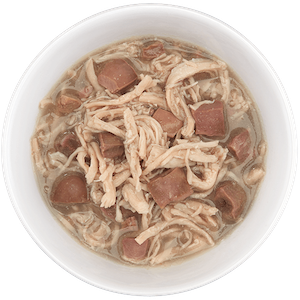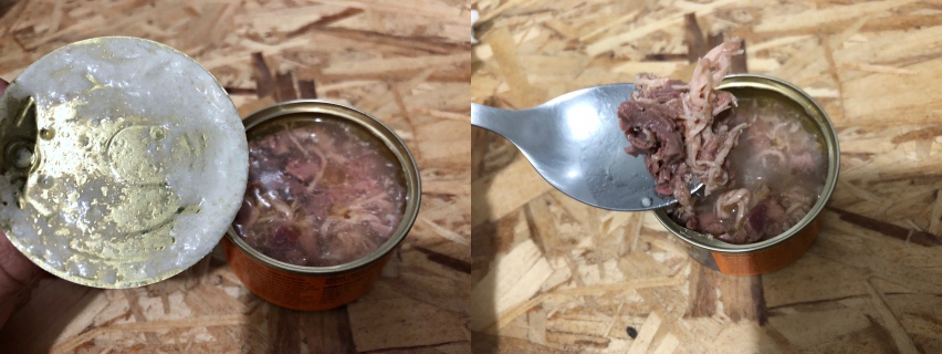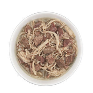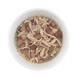 Tiki Cat這兩個系列的罐頭都沒有添加膠類成分,所以基底是清湯狀,和每克思那種黏稠狀的湯底不太一樣。雞肉是雞肉絲,雖然口味叫做雞肉+牛肉,但是含量最多的是雞肉和雞肝、雞心、雞胗等內臟。